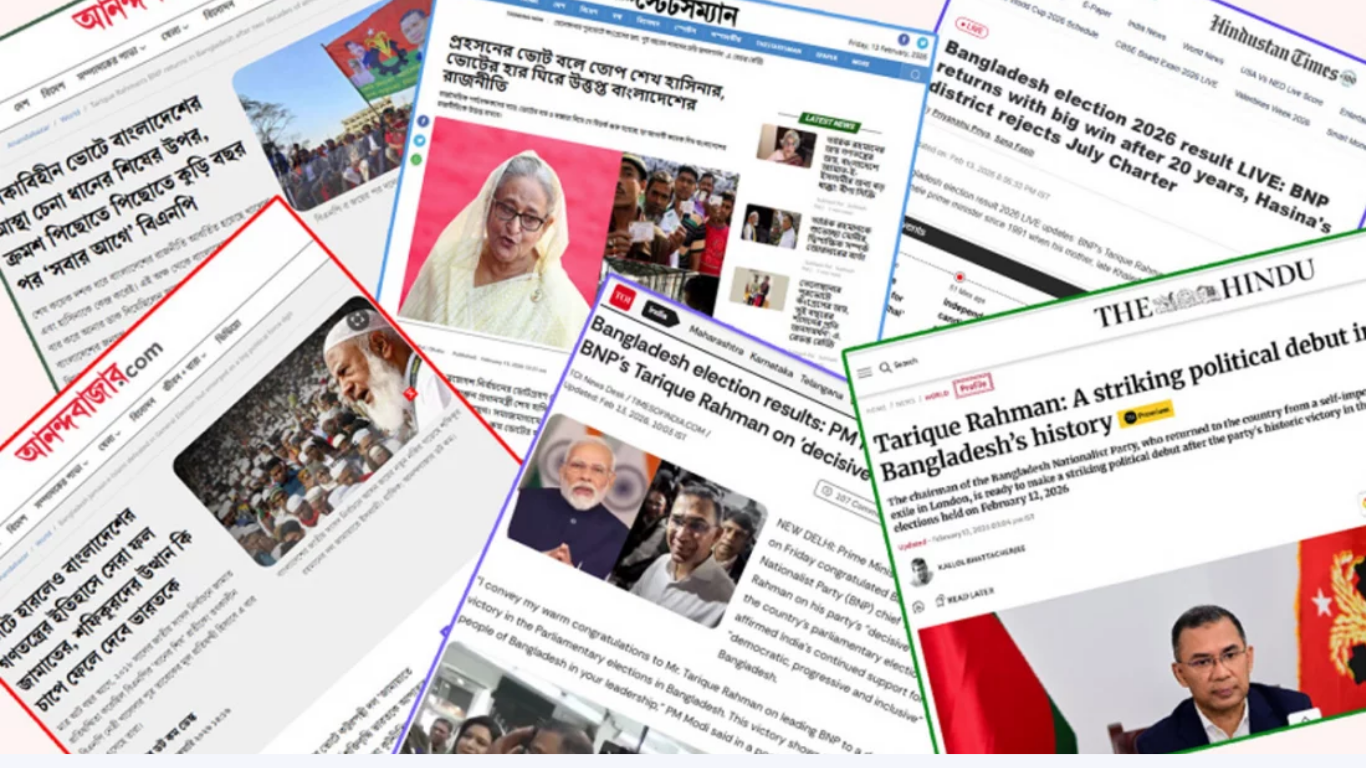 - আনন্দবাজার পত্রিকা: তাদের প্রধান প্রতিবেদনে লিখেছে— ‘নৌকাবিহীন ভোটে বাংলাদেশের আস্থা চেনা ধানের শিষের উপর, ক্রমশ পিছোতে পিছোতে কুড়ি বছর পর “সবার আগে” বিএনপি।’ তারা বিশ্লেষণ করেছে যে, বাংলাদেশের মানুষ এখনো পরিচিত নেতৃত্বের হাতেই শাসনভার দিতে বেশি স্বচ্ছন্দ।